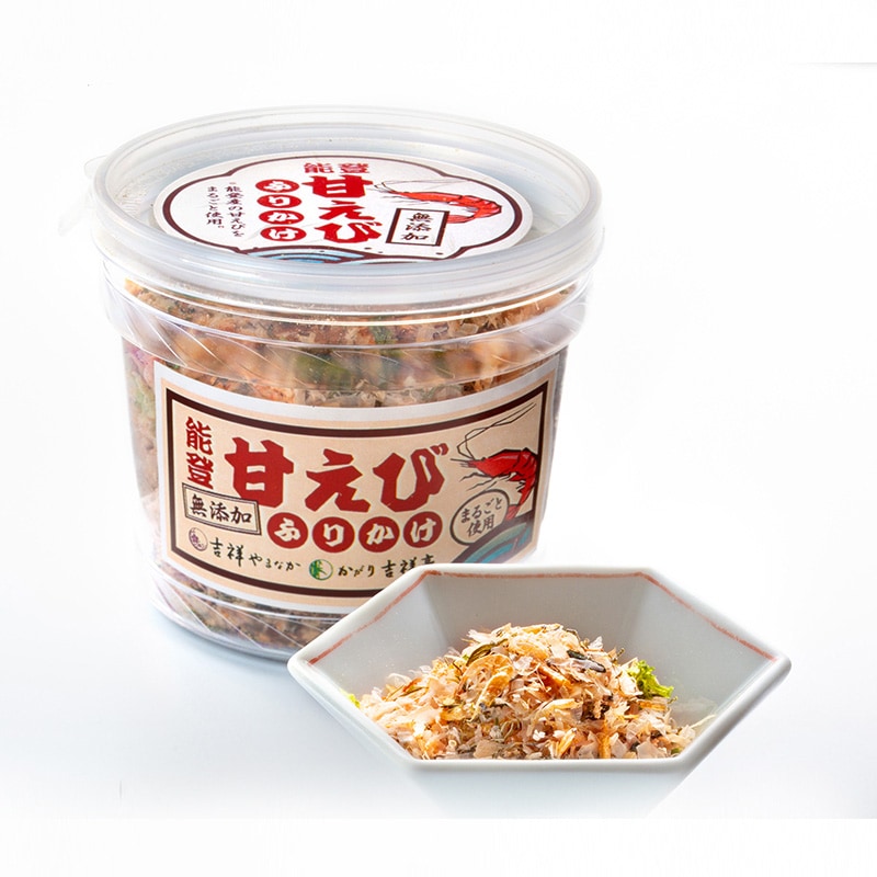 「海苔の佃煮」吉祥やまなか.かがり吉祥亭の朝食でもご提供しております「海苔の佃煮」は海苔本来の風味、甘さをたっぷりと味わえ、ご飯がすすむ逸品です。「甘えびふりかけ」能登産の甘えびをまるごと使用し、厳選したかつお節、昆布など様々なだし素材をブレンドしました当館オリジナルふりかけ。「ちりめん山椒」じゃこの旨味.甘味と山椒香るちりめん山椒はスタッフもおすすめの大人気商品です。